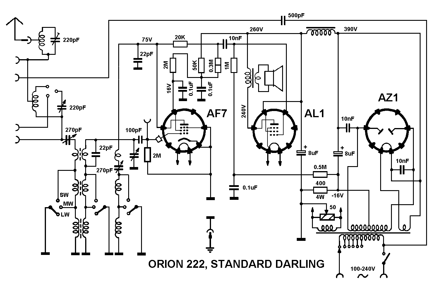 The transformer made with taps for all the many differing line voltages of the time, from 100 VAC to 240 VAC at 50 Hz. The set used a full wave rectifier using the standard AZ1 power rectifier dual diode tube. The AF7 reflex audion was followed by the powerful AL1 audio output stage. Audio input is provided for the record player, coupled directly to the base of the AF7. This set, as many others at the time, used the speaker magnet coil as a power supply filter coil. This exact set was also sold by the Orion Company as receiver type 222.